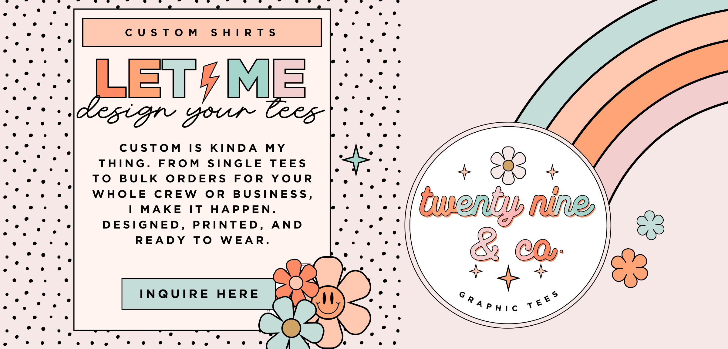 I found a way to combine my love for fashion with my artistic abilities and create Twenty Nine & Co. in 2023. I love to bring cute graphic tees to life and offer them to you all. I offer my services to create custom designs for individuals and businesses as well.