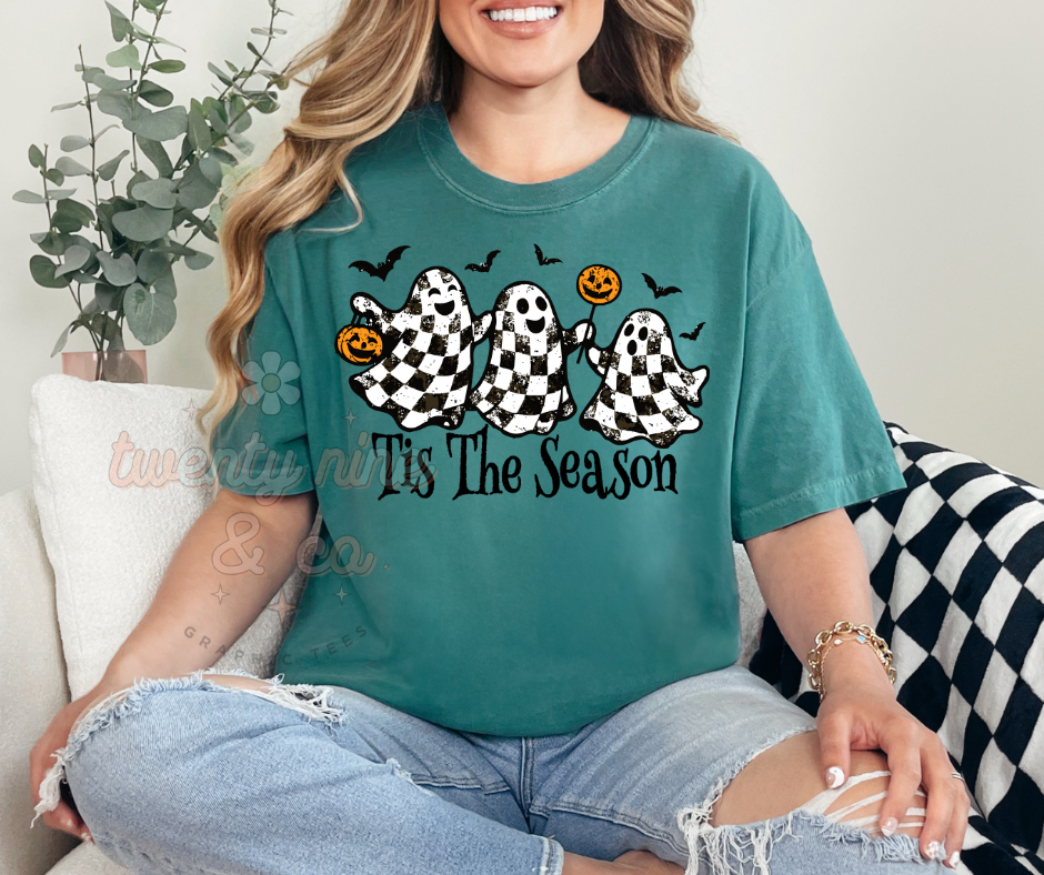 Cozy up for spooky season with our Tis The Season checkered ghost tee, perfect for pumpkin patches, trick-or-treating, and all fall vibes. ππ»